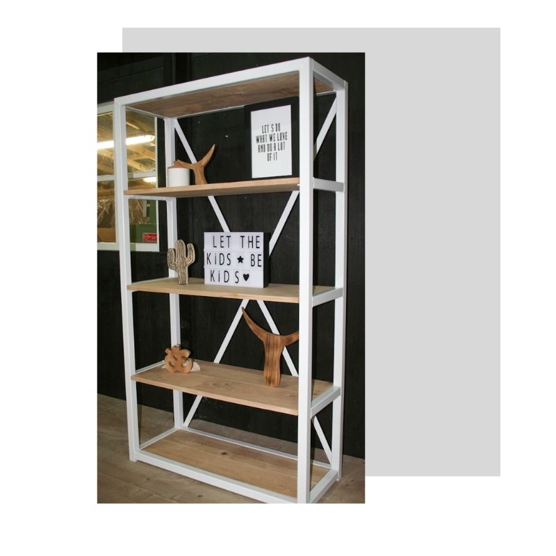 De boekenkast eikenhout en staal 1 zoals op de foto heeft een mat witte poedercoating op het staal.