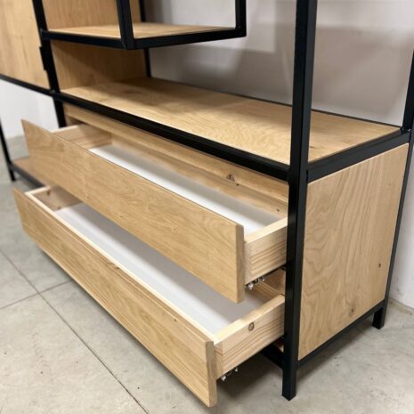 In alle afmetingen heeft deze kast dus 2 lades, een vak met dubbele deur en een vak met enkele deur. En natuurlijk evenveel open vakken.