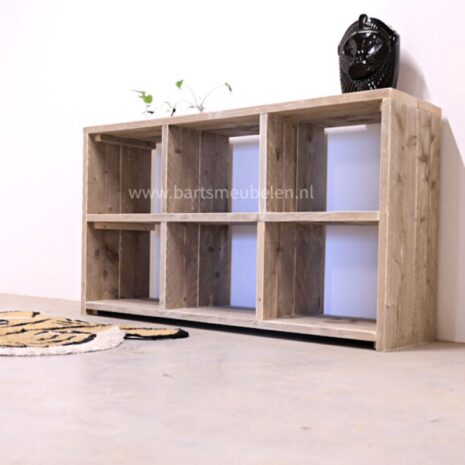 Deze opbergkast van steigerhout heeft totaal 6 vakken verdeelt in 2 rijen van 3 vakken. Natuurlijk handig om losse spullen in op te bergen maar hier een persoonlijke favoriet om te vullen met de bekende Ikea bakken ;).