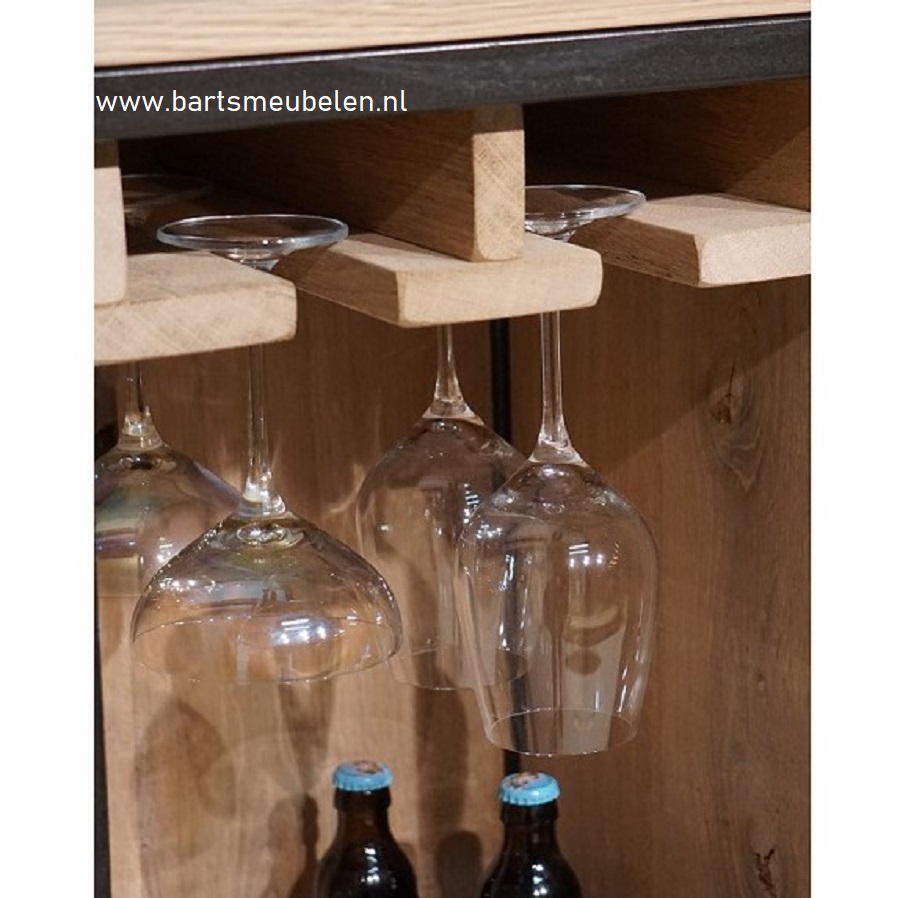 Deze mooie wijnkast van rustiek eikenhout en staal is gemaakt van stalen koker 25 x 25 mm en is ingelegd met rustiek eiken van +/- 25 mm dik. Deze wijnkast zorgt voor genoeg opbergruimte voor uw wijn- en andere drankflessen. Ook bied deze wijnkast genoeg ruimte voor de bijbehorende glazen. Deze kunnen ook in het glazenrek bovenin gehangen worden.