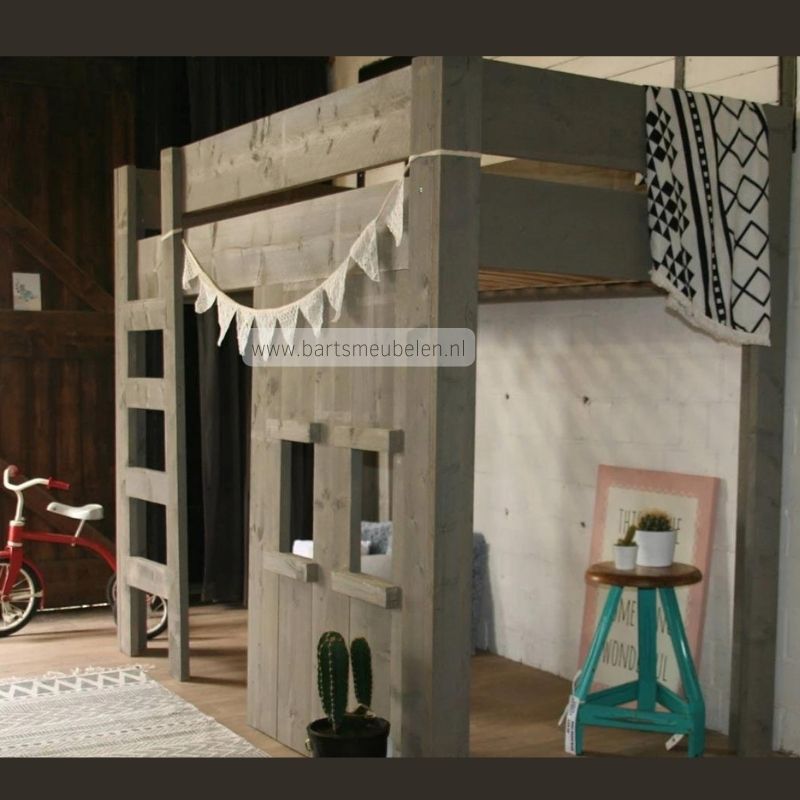De steigerhouten hoogslaper Pip op de foto is gemaakt van old-look steigerhout en heeft een grey-wash kleurbehandeling gehad.