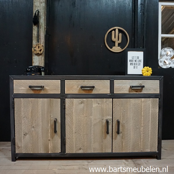 Je ziet het steeds vaker, de combinatie van hout en staal. Bij dit dressoir is gekozen voor een combinatie van steigerhout en staal. De combinatie van het stalen frame ingelegd met steigerhouten planken maken het dressoir een stoer product. En natuurlijk maken de stalen handgrepen het plaatje helemaal af.