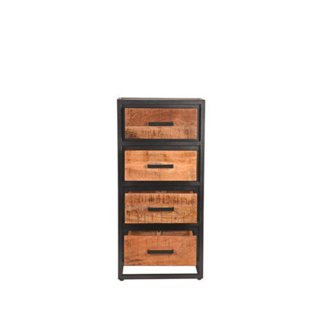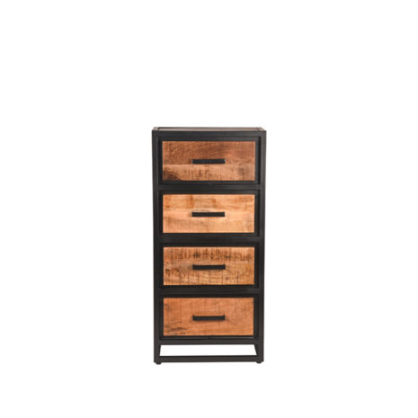 De karakteristieke ladekast Tampa in de kleur rough is gemaakt van mangohout en metaal. Het meubel heeft een gave balans in materiaal; een basisframe uitgevoerd in zwart metaal met verder alle zijdes uitgevoerd in rough mangohout. De fraaie, zichtbare houtnerven zorgen voor een individueel karakter met charme. Het meubel heeft 4 royale lades, dus genoeg ruimte om in op te bergen. De lades zijn voorzien van stijlvolle, strakke metalen greepjes in de kleur zwart wat het geheel helemaal afmaakt.