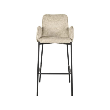 Barkruk Joni, uitgevoerd in desert elegance heeft een luxe ronde zitting, rugleuning en is in het bezit van armleuningen. Deze combinatie maakt Joni een luxe barkruk met ontzettend veel comfort. De armleuningen lopen achter de rugleuning langs waardoor de barkruk een uniek uiterlijk krijgt en er ook nog eens ontzettend leuk uitziet aan de achterkant. Dat is natuurlijk een fijne bijkomstigheid als de barkrukken aangeschoven staan aan tafel of een bar. Het ranke maar doorlopende zwarte frame waar de zitting als ware op rust geeft de barkruk een luchtige uitstraling. Het U-frame zorgt voor een makkelijke op- en afstap en dient als voetensteun. De uiteinde van het frame loopt op vier zijdes een klein stukje door wat zorgt voor een speels effect.