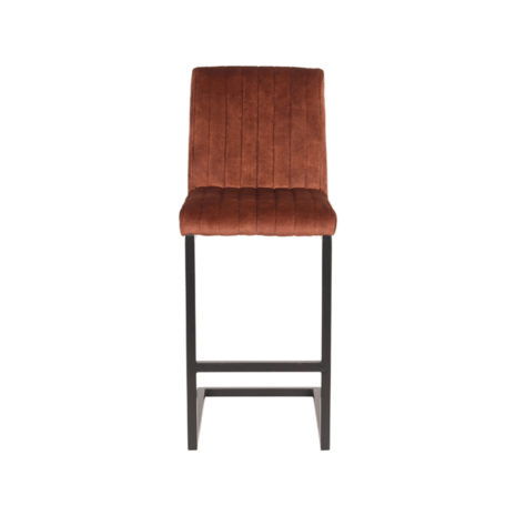 Barkruk Milo, uitgevoerd in een luxe rust kleurige velours heeft een vierkant gevormde zitting voorzien van een luxe stiksel. Het stiksel bestaat uit 8 verticale banen. Het u-vormige metalen frame in de kleur zwart geeft de stoel naast zijn fraaie en elegante uitstraling ook nog eens een bijzonder comfort door de lichte vering in de sledepoot. De poot is voorzien van een extra horizontale pijp waar je je voeten op kunt laten rusten.