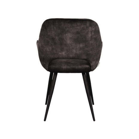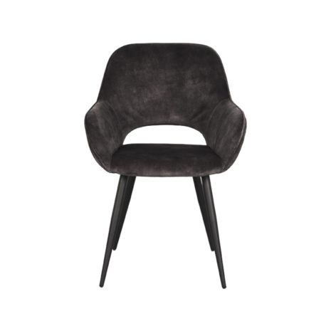 Fer, uitgevoerd in antraciet velours heeft een ronde zitting voorzien van elegante rondingen. De mooie ‘curve’ van de zitting naar de arm- en rugleuning geeft deze stoel ontzettend veel charme en comfort. De fraaie uitsparing in de rugleuning geeft de stoel een luchtig en speels karakter. De zwarte, naar buiten staande poten zorgen ervoor dat de stoel lekker stabiel op de grond staat en draagt daarnaast bij aan de leuke speelse touch.