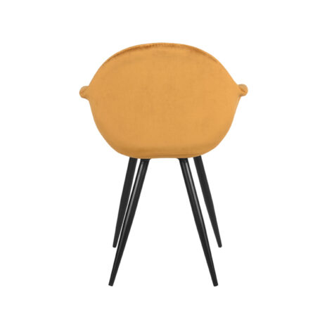 Eetkamerstoel Forli, uitgevoerd in oker kleurig fluweel heeft een zeer luxe en comfortabele kuip voorzien van elegante rondingen en armleuningen. De prachtige duurzame basis als kuip gestoffeerd met het mooiste fluweel zorgt voor een comfortabele, stevige zit. Forli is in het bezit van licht uitlopende poten, uitgevoerd in zwart metaal, waardoor de stoel stevig op de grond staat en ook nog eens een leuke speelse touch krijgt.