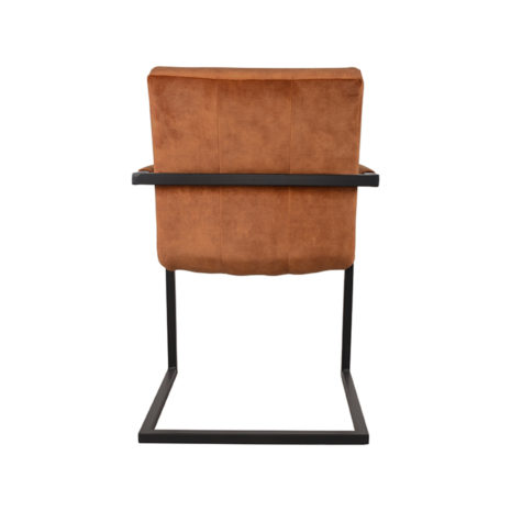 Eetkamerstoel Milo, uitgevoerd in een luxe oker kleurige velours heeft een vierkant gevormde zitting voorzien van een luxe stiksel. Het stiksel bestaat uit 8 verticale banen, uitgevoerd op zowel de voorkant van de rugleuning als op de bovenkant van de zitting. Het u-vormige metalen frame in de kleur zwart loopt door als armleuning en geeft de stoel naast zijn fraaie en elegante uitstraling ook nog eens een bijzonder comfort. Als kers op de taart heeft de armleuning een fijn gestoffeerd armvlak.