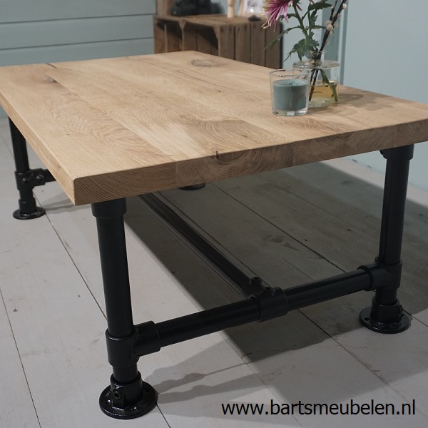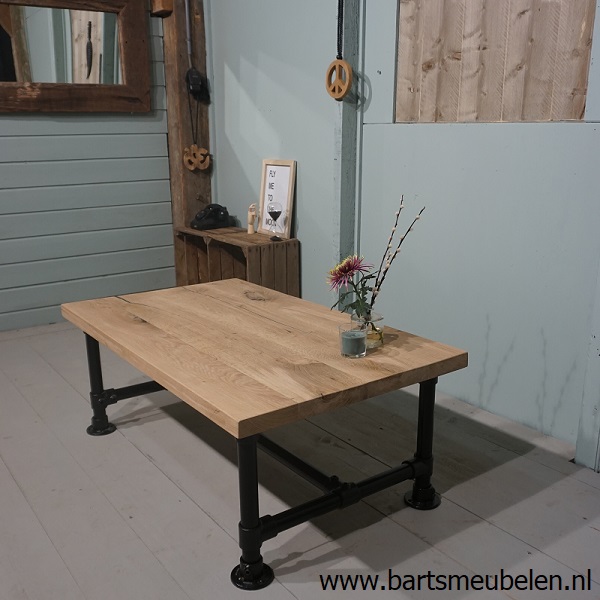 Deze prachtige eikenhouten salontafel Leroy is gemaakt van massieve eikenhouten planken van +/- 40 mm dik en heeft een onderstel van zwart steigerbuis. Tussen de opties kiest u zelf de afmetingen.